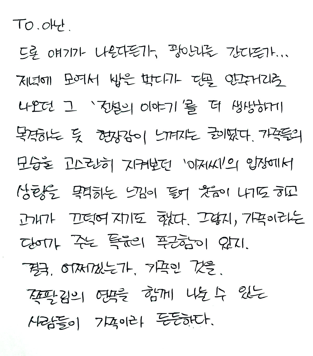 엄마는 활짝 웃으며 “야! 원래 가족은 쪽팔림의 연속이다.”라 말하고는, 남편과 나를 번갈아 안아주었다. 아버지는 “명언이네. 맞다! 사는 게 원래 이렇게 사는 거다!”라며 그럴 수 있다고 따뜻하게 웃어주셨다. 나는 나의 경솔함을 반성하며 입방정을 떨지 않겠다고 다짐했다. 이후 우리 가족은 ‘드론’이라는 이야기만 들어도 그날로 돌아가 “가족은 쪽팔림의 연속이다!”를 외치며 웃었다. 그렇게 서로의 못난 순간을 안아주고 때론 낄낄거리며 넘어간다. 우리의 시간은 쪽팔린 어제를 너그러운 오늘로 덮어주며 흘러가고 있다.